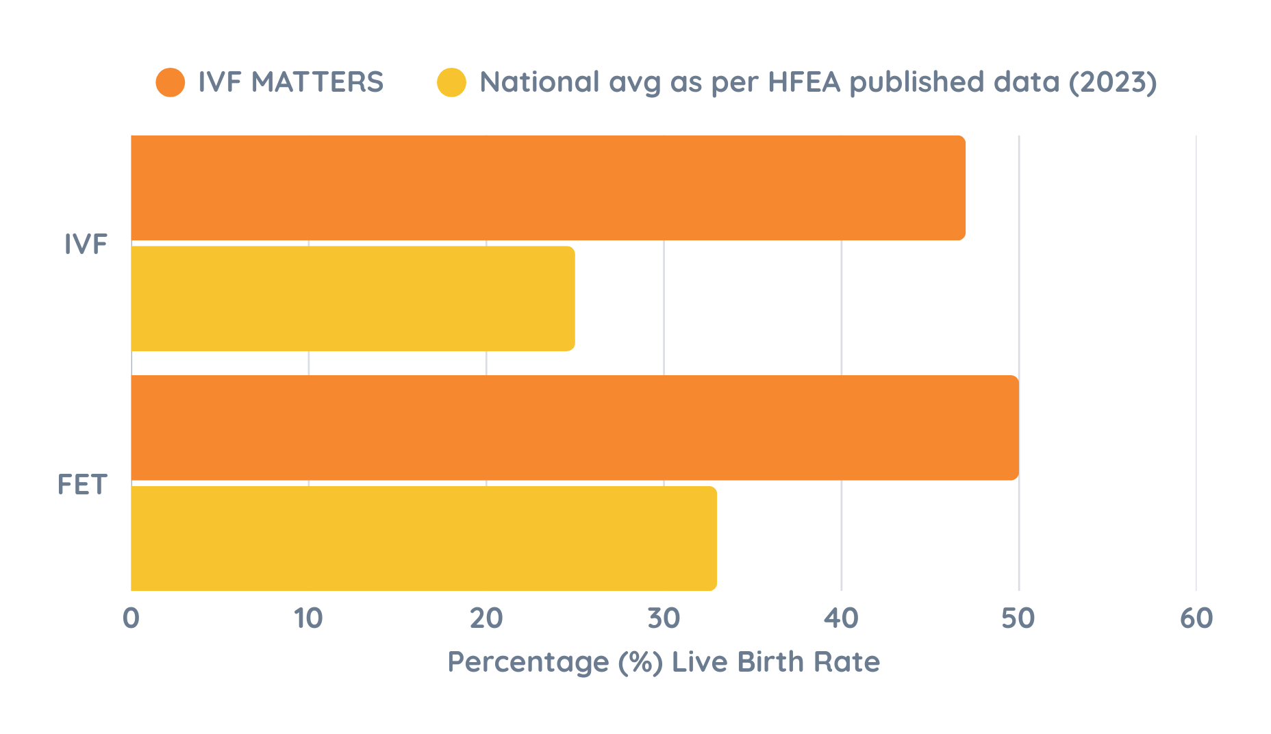 Based on HFEA national data (2023), IVF Matters achieves IVF and frozen embryo transfer success rates that are above the UK average.